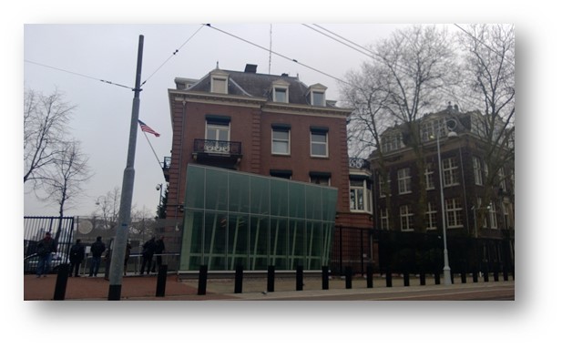Heel goed dus. Sandra en ik stonden vanmorgen om 9:00 voor de ingang. Daar stonden buiten al mensen te wachten. We werden door een Amerikaanse beveilingsbeambte naar binnen begeleid. Daar moesten we de tas van Sandra inleveren. Riemen af en door een detectiepoort. Alle documenten en tijdschriften in de hand (die hadden we voor de zekerheid meegenomen voor als we lang moesten wachten). We kregen een volgnummer en werden naar een wachtruimte gestuurd.