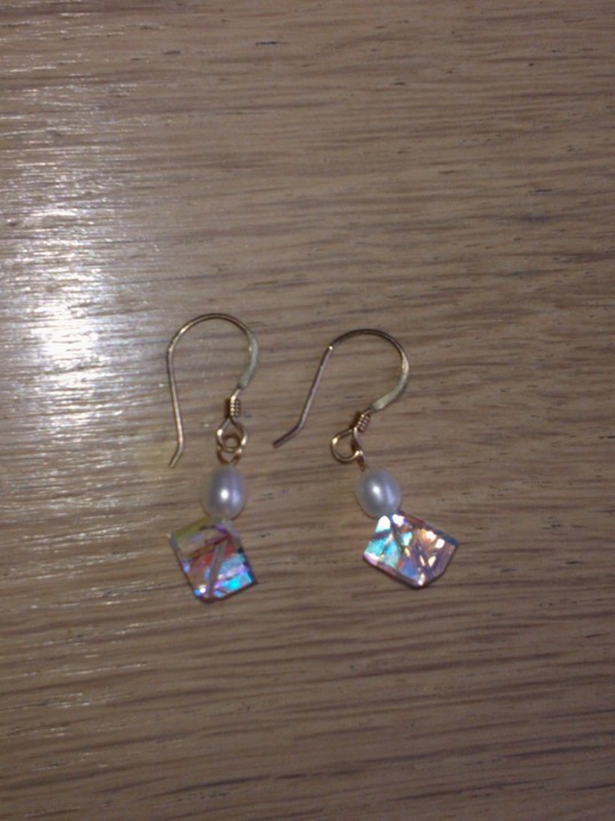 Figure 10 Lange oorbellen (vanaf het haakje iets meer dan 7 cm.) van echt zilver met zoetwaterpareltje € 10,00.